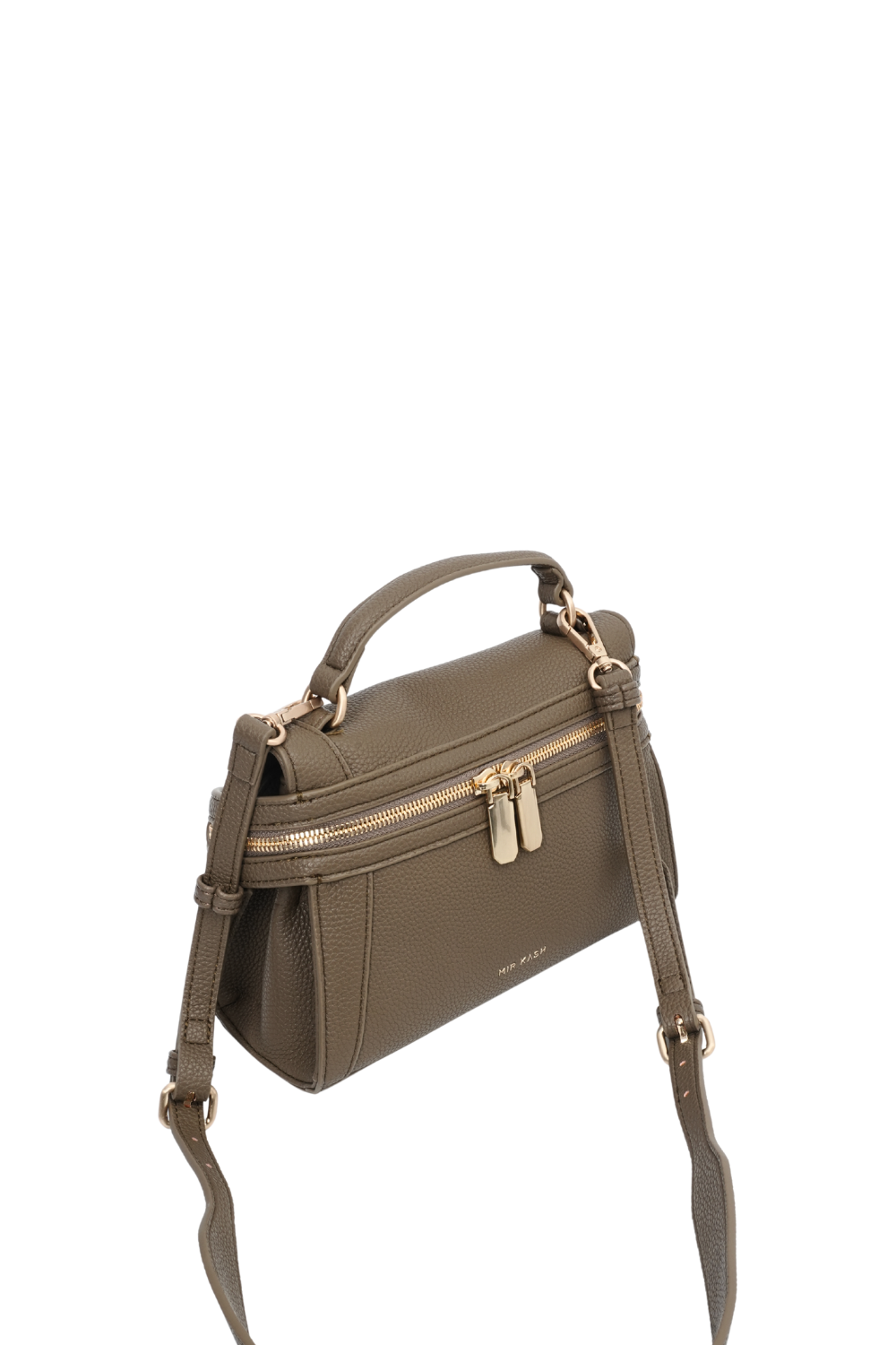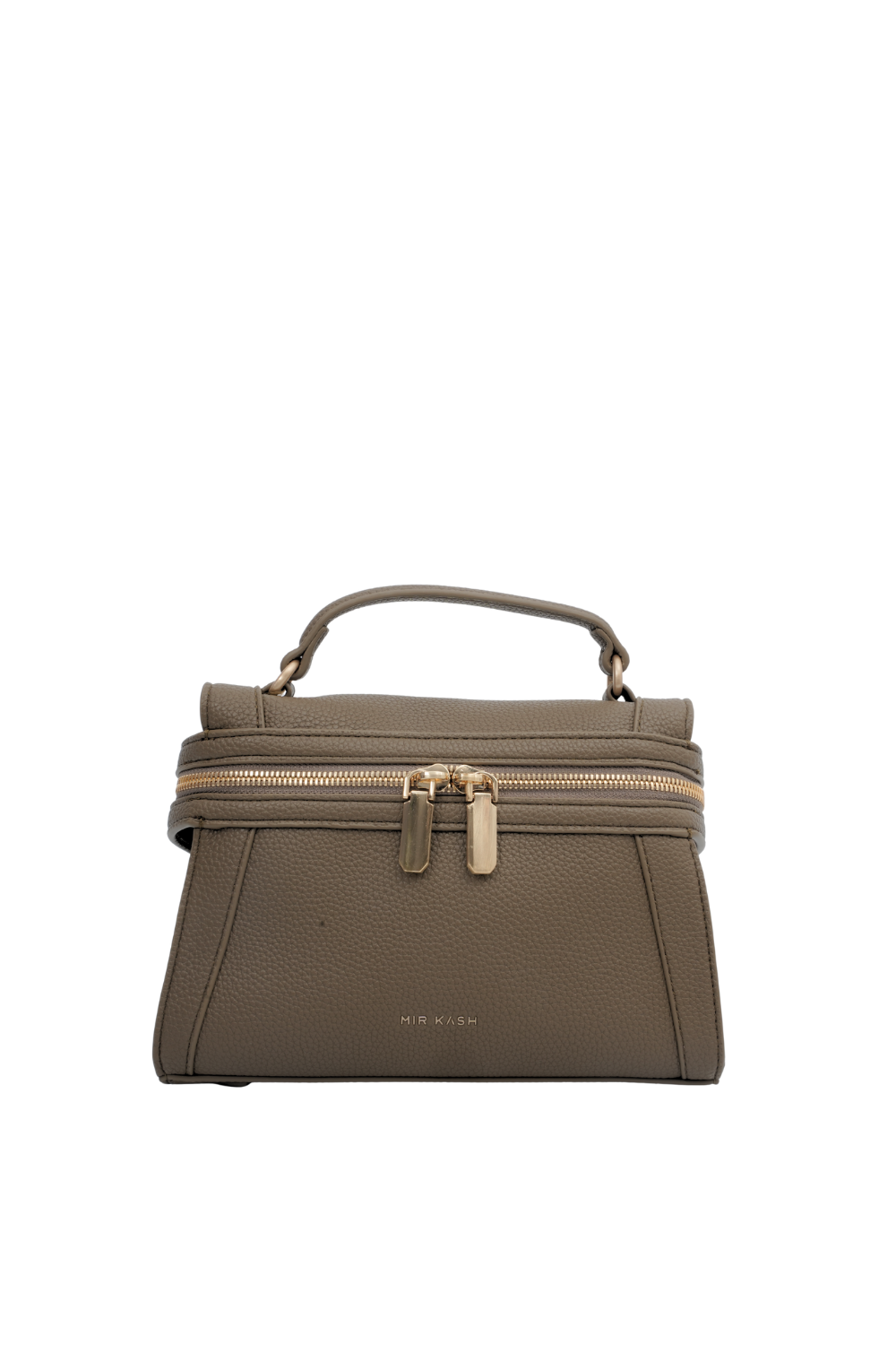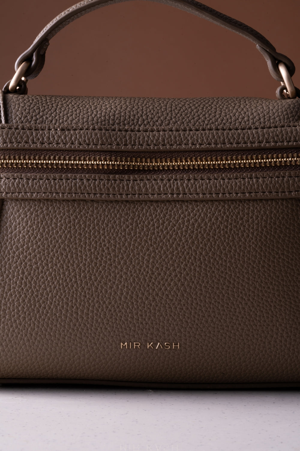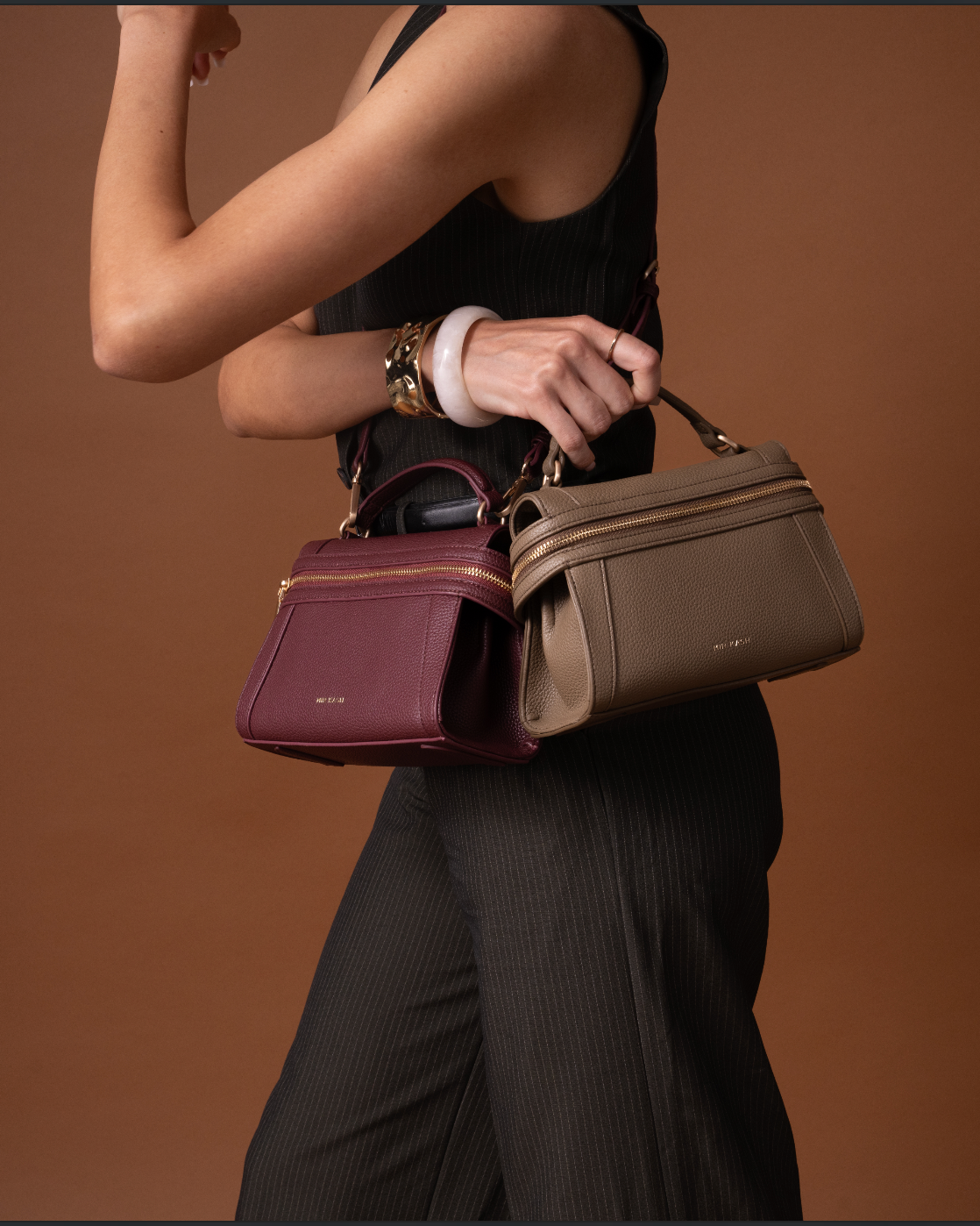 - 100% vegan materials - Pebbled leather exterior - Polyester linings - Height with Handles: 41cm, Body Height: 20cm, Width: 9.5cm, Length: 22cm - Magnetic flap on zipper corners - Zipped compartments in the interior